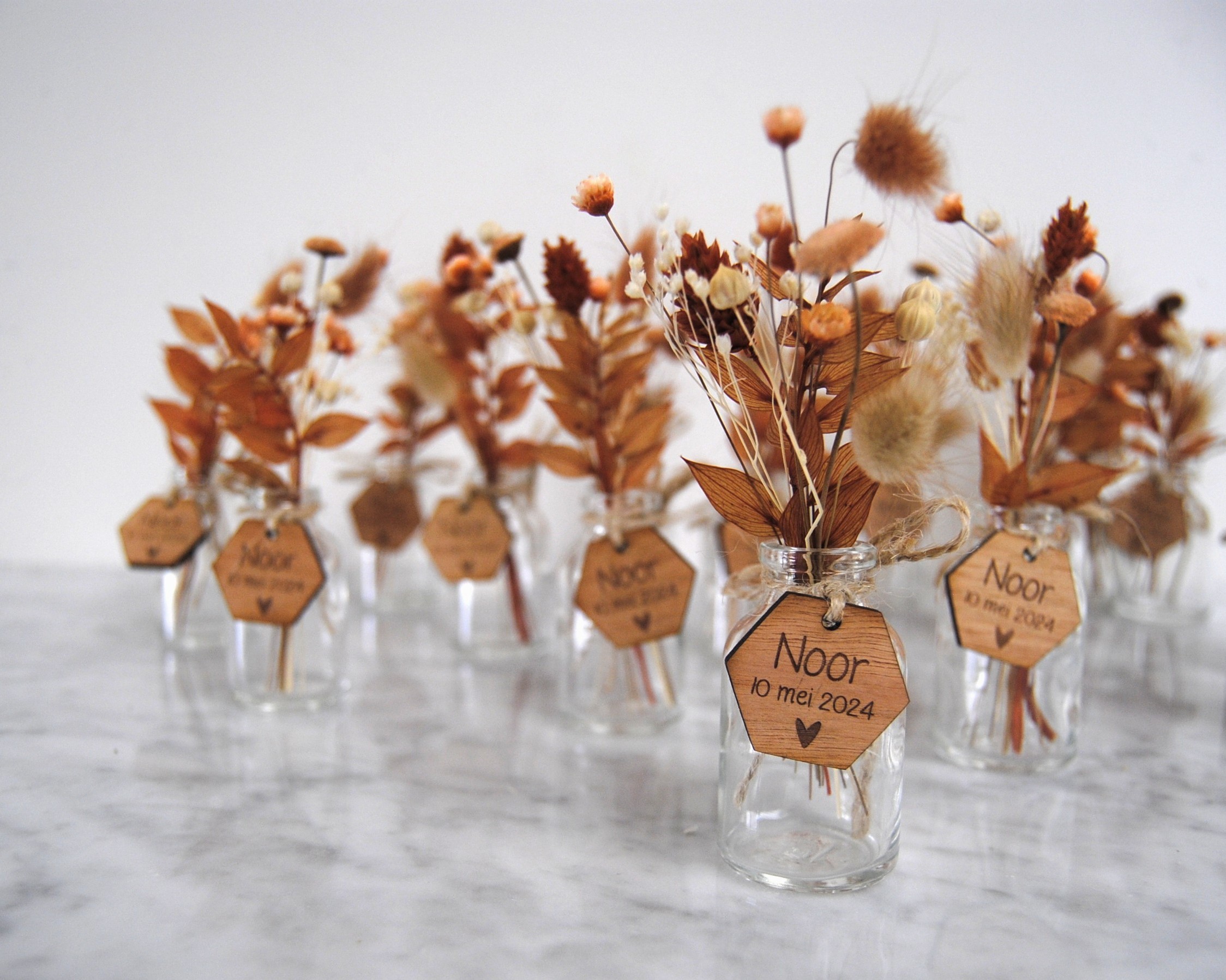 Je kan deze vaasjes ook makkelijk personaliseren met een houten label of label in (spiegelend) acryl. Liever een kartonnen label met gegraveerde naam of eentje waar je zelf de naam op kan schrijven of stempelen? Bekijk hier alle labels op maat.